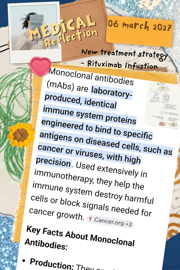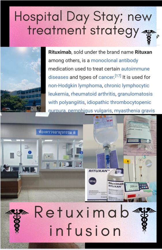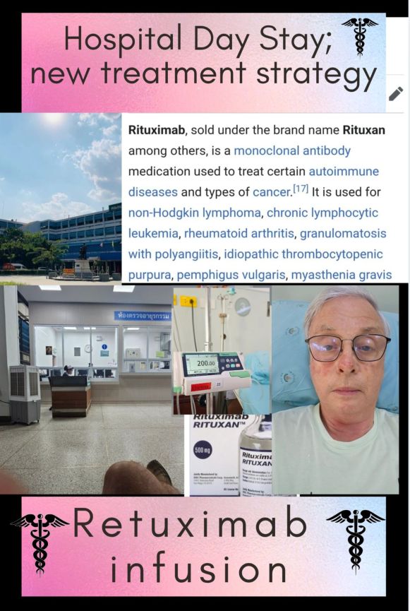This is involving a very slow infusion of an “monoclonal antibody”, called “Rituxibad”, delivered on the chemotheropy ward. Protocol requires 2 very slow infusions, taken 2 weeks apart.