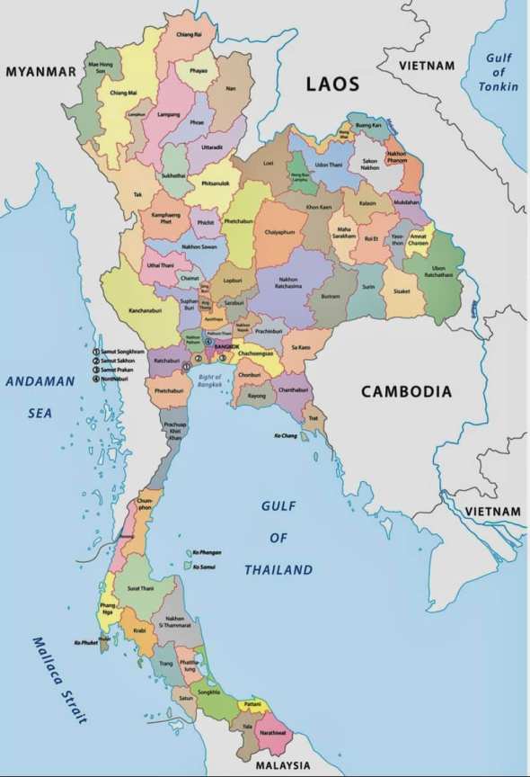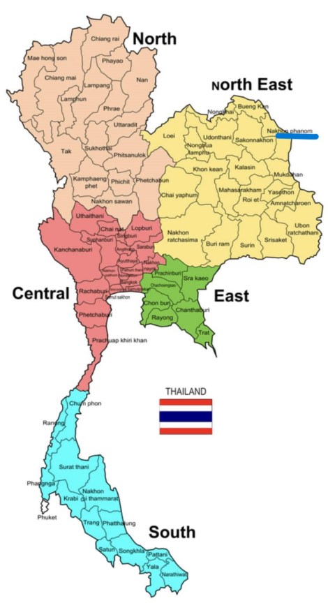 Thailand is broken up, generally, into five regions as depicted in the map below. We will be located in the “North East Region,” in Nakon Phanom province (as highlighted on the map). You can see from the second map that we are located on the border with Laos & where we sit with respect to other countries in the Region, such as Cambodia, Vietnam, and Myanmar.