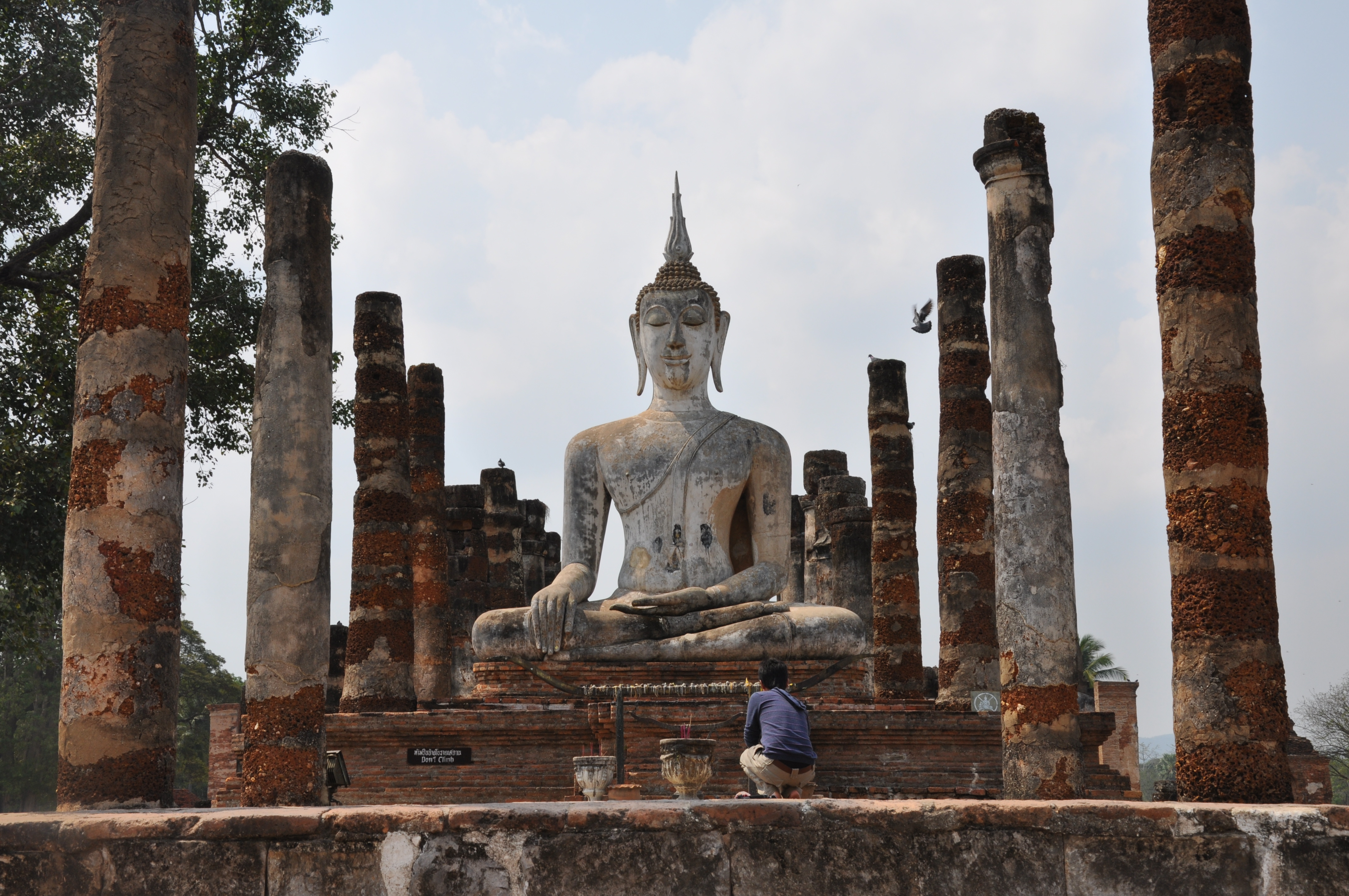 Central zone contains 11 ruins in 3 square kilometres, interspersed with moats, lakes and bridges to some island-bound ruins. Wat Mahathat is one of the most spectacular, with a large seated Buddha figure set amongst the pillars of a now ruined sala, and a central chedi flanked by two standing Buddha figures.