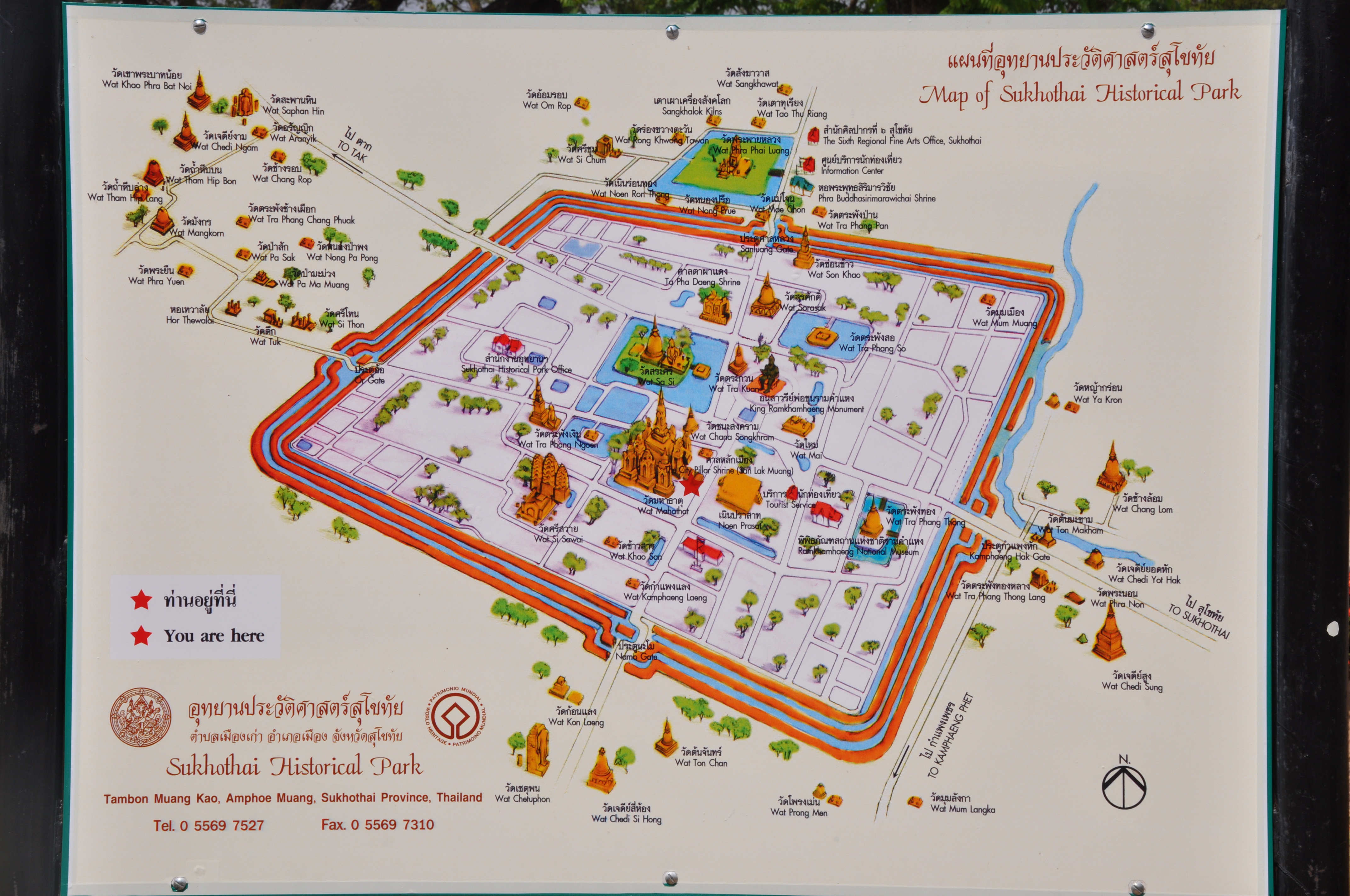 The best way to see the ruins in the Sukhothai National Historic Park is by bicycle. These can be rented from a shop opposite from the main park entrance. It is feasible to walk around the central and northern zones in 6 hours or so. There is also a 40 baht guided tour by electric tram available. The best time to see the ruins is mornings when it’s a little cooler and before the busses arrive. Maps are free at the ticket office. Open from 06:00 to 18:00.