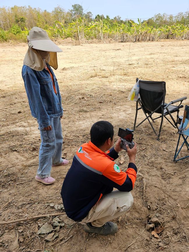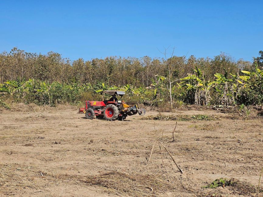 Ace’s mom, who lives about 50 km away in Nakhon Phanom, has adjacent land & knows all the locals so arranged for a farmer to clear some of the land to be able to survey the building site.