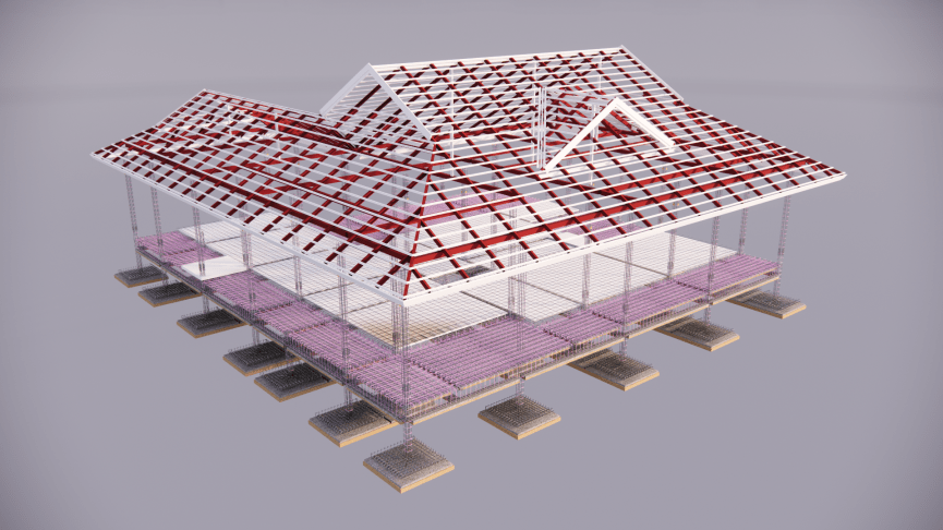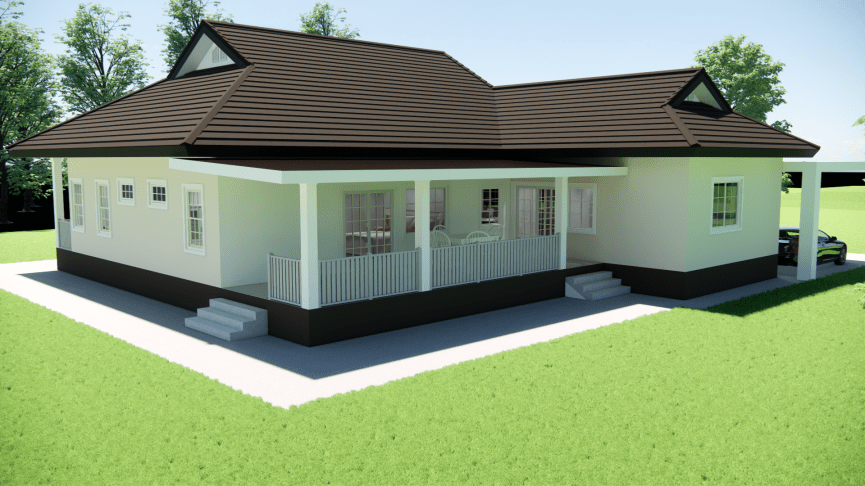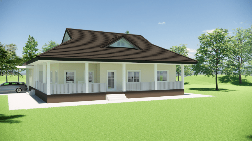 The design is based on a farmhouse-like approach with porches on the east, south, and west sides of the house to reduce sunlight on the walls. The roof has gables to allow for ventilation & air flow to allow for heat to escape the roof cavity (given the intense sun of Thailand).